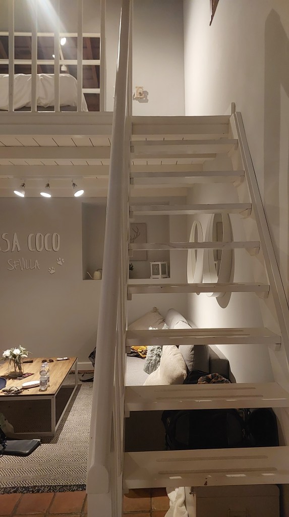 But how to get in? The next potential sour note was the saga of the keys. We knew what floor, and what number. The lobby was cool, dark, and utterly uninformative. At length, we gave in and I bravely prepared to phone the host contact – of all our Booking.com locations this was the only one that didn’t direct message for some reason. Everything had come via email (including as it turned out, the one I never got with the crucial instructons). I translated some suitable passages and practised quickly, then dialled away. Fortunately the gracious lady on the other end understood my fumbling Spanish and had some English. We soon discovered there was a cleverly hidden-in-plain-sight key box and before long we were bouncing merrily up 3 flights to our lovely little studio. OK, bouncing is a stretch, unless you count the wheelie duffel thumping on each step. But we had made it! (Again, thank God I bought a sim card).